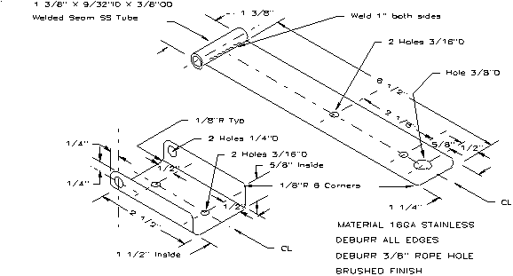 Start with a pair of Rail Mounts. They are bolted firmly to each other to make a right-angle mount for the outrigger arm. The outrigger arm is necessary so the sensing line does not get hung up on your hull topsides and to allow free and clear positioning of the hinge assembly. About 12 to 18 inches clearance works OK so add 4" for the clamp area and add the distance from the deck stantion to the edge of the hull. For the outrigger arm, use a piece of aluminum tubing the same diameter as the stantion (so the same size Rail Mount can be used). PVC tubing is not stiff enough however it works OK if you insert a close fitting wooden dowel rod inside and glue on a pair of end caps, or glue the outboard end into an electrical junction box as shown in the photo.