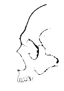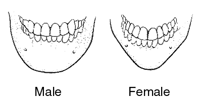 Figure A Shows the outline of a typical male skull contour. Notice the prominent brow ridge and large nasal cavity. The forehead also has a much more vertical slope to it. Figure B shows a typical female skull contour. Note the smaller nasal cavity, as well as the curvature just above the teeth. There is also no brow ridge and the forehead is much more curvilinear.