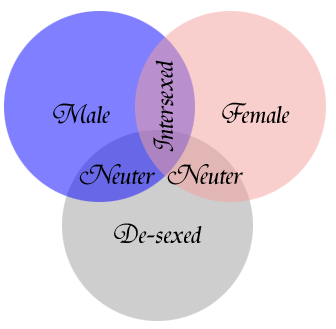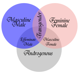 So a people who are male-to-female transsexuals and are attracted to men would be inclined to say, from their perspective, they are "heterosexual." From societies perspective, which places emphasis of sexual identity on physical being, that same person would be considered "homosexual." Q. Isn't being transgendered a "lifestyle choice?" A. The phrase "lifestyle choice" is propoganda and misinformation designed to make people believe that being transgendered (or gay, as there is usually no distinction drawn) "choose" to be as they are. This is because the people who call it a "lifestyle choice" want to believe a person can be talked out of being gay or transgendered. This is patently UNTRUE! Given the social stigma, ostracism, prejudice, and abuse why would ANYONE "choose" to be a social outcast? Why would anyone "choose" to place themselves in a group that is a target of violence? There is a growing body of scientific evidence that people ARE born with a predisposition to their sexual behaviors. While there is no conclusive evidence that there is a biological cause for either homosexuality, recent research strongly suggests there IS a biological cause for transgenderism. Tests performed on animals proved that - once sexual behaiors are set during fetal development - it was not possible to alter the brain structure or behavioral patterns afterward. People should just accept that there is no element of "choice" involved. Many choose to suppress their natural behaviors out of fear, but doing so does not change their self identity and often results in depression and suicide. Q. Aren't "sex" and "gender" the same thing? A. Sex" and "Gender" are not the same thing It is a common misconception that "Sex" and "Gender" are one in the same. For most people these two things are in sync with one another and it seems quite natural - in fact, most people who have no conflicts between their physical sex and their gender identity cannot even understand how such a thing is possible. It, unfortunately, IS possible. "Sex" refers to the physical sexual organs with which a person is born. "Gender" refers to how they perceive themselves psychologically. "Gender" or Psychological Sex We are usually taught in school that there are only two sexes, MALE and FEMALE. We are also taught that these are defined by our "sex chromosomes," where XX makes a person "female" and XY makes a person "male." What is often overlooked is that there are variations that do not fit into either classification. When this occurs, it is referred to as an "Intersexed Condition." GENETIC SEXES This occurs far more commonly than is generally known. One estimate (by the Intersex Society of North America) indicates that the total of ALL intersexed conditions is as common as 1 in every 100 births. Because of the wide ranging effects of chromosomal anomolies, however, not all cases of intersexed conditions are identified. The effect on a developing fetus varies widely due to a number of factors. Some of these children are born with what are called "ambiguous genetalia" (the doctor cannot determine if the child is male or female). However, most children born with chromosomal anomolies will appear to physically be either male or female and will be "sexed" as such by the doctor and raised in the assigned gender role. Various physical problems, however, may occur during puberty when contrasexual secondary characteristics may develop (such as breast growth in a "boy" or facial hair on a "girl"). The most common arguement made by the layperson concerning people who have a contrasexual gender identity is that it should be obvious to any fool that "males" have a penis and testicles, and "females" have a vagina and ovaries. As the aforementioned piece on genetics shows, though, this is an over-simplified view of biology. PHYSICAL SEX "Males" would, of course, have a penis and testicles. "Females" would have a vagina and ovaries. However, as the piece on genetics shows, there are a number of "Intersexed" conditions where an individual will have characteristics of both sexes (termed "psuedohermaphrodite male" or "psuedohermaphrodite female" because "true hermaphrodites" having two sets of sex organs are exceedingly rare). "Neuter Male" would refer to any male who was hypogonadic (underdeveloped testes) or lacking testes altogether. If the testes were surgically removed it is called a "Bilateral Orchidectomy." Such operations are often performed on men with testicular cancer. "Neuter Female" would refer to any female lacking ovaries. "De-sexed" refers to any person with NO sexual organs of any kind, who may otherwise physically appear to be either male, female, or androgenous. The overlap area of "De-Sexed" and "Intersexed" refers to people without sex organs who's appearance is inconsistent with their apparent sex. Many of these physical sexes are the result of either genetics or surgery. Q. Is there a "cure" for GID? A. In a manner of speaking. Transsexualism, a form of Gender Identity Disorder, is defined by a person who has a sexual self-identification that is at odds with their physcial form. This usually leads to psychological distress called "dysphoria." The aim of treatment for transsexuals is the relief of that distress. In the past many attempts were made to modify the person's thoughts (i.e., mind control or "brain washing"), via hypnosis, aversion therapy, shock therapy, or drug therapy. None of these methods ever proved effective and often did more damage and inflicted more trauma on the patient than anything else. Today the medical community does not advocate any attempts at "changing the patient's mind." Today the focus of medical treatment for transsexualism is on altering the body to more closely conform with the individuals self-image, which may include Sex Reassignment Surgery (SRS) and/or other surgical procedures. It has proved a far easier and much more effective treatment to make a GID patient's body align with their mind than the ot