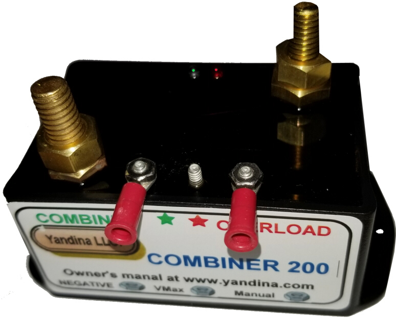 | The Combiner 200 is a voltage-sensing relay (13.1 volts) which connects two batteries together when either is receiving a charge. When the charging ceases, the relay opens so that each battery operates independently. Supplemental battery banks can be added by using an additional combiner for each bank. You never have to worry about switching to "BOTH" when your engine is running and forgetting to switch back to save your starting battery from discharge when you stop. For alternators greater than 200 amps use the Combiner 600 |